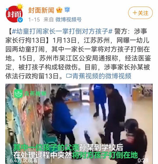 2021年1月,江苏苏州某幼儿园两名小男孩打闹,其中一名男孩的家长到学校后,直接一记耳光把对方男孩打倒在地。该家长也因殴打他人依法处以行政拘留十三日的处罚。