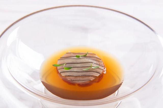 甲鱼 | 竹丝鸡 · 石斛 · 芹菜 :以甲鱼做清汤 (turtle soup) 是一道奢华的法国菜式。而这道菜灵感源自广东炖汤,用新鲜甲鱼和乌鸡搭配石斛和枸杞子熬炖,搭配以清汤和花雕酒炖煮的甲鱼裙边、清爽的芹菜丝和枸杞子,滋补养颜。