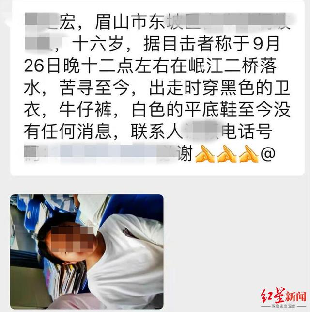 在寻人启事上,谢颖这样写道:“宏宏,眉山市东坡区富牛镇,十六岁,据目击者称于9月26日晚十二点左右在岷江二桥落水,苦寻至今,出走时穿黑色的卫衣,牛仔裤,白色的平底鞋至今没有任何消息。”