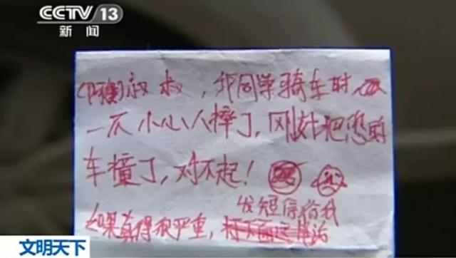 可他却坚持要为这件事情负责,于是去附近的小卖店买东西要了一张纸,写下上面那张字条。
